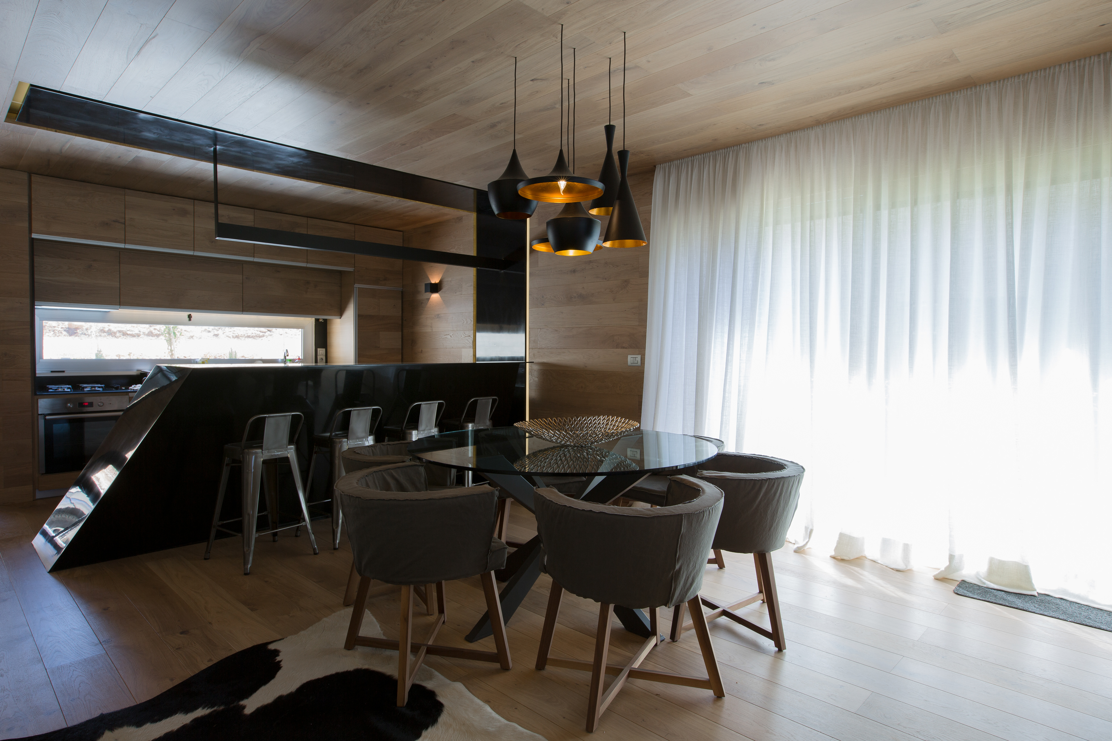 Inside this pure and regular volume, a striking deconstructivist bar in black steel and resin disrupts the calm order, acting as the focal point of the space.The project is defined by custom-made elements: the fireplace, kitchen cabinets, bar, tables, sideboards, lighting accessories, TV unit, and even an elevated bed in the bedroom. This tailored approach ensures that every piece belongs to the architectural narrative.